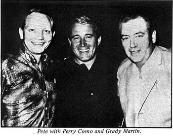 I guess what really got me in was the "Pete Drake style" on the C6th tuning. When I first came up here everybody thought it was square, so I quit playing like that and started playing like everybody else. Then one night on the Opry, just for kicks, I went back to my own style for one tune behind Carl and Pearl Butler. Roy Drusky was on Decca then, and he come up to me and said, "Hey, you've come up with a new style. I'm recording tomorrow, and I want you with me." So I cut this session with him, and the word kind of got out that I had this new style (actually, it was the same thing I'd been playing for years in Atlanta, but it was new in Nashville). That month I did 24 sessions, and it's been like that ever since. That was in the middle of 1960, and that first record was "I Don't Believe You Love Me Any More," a number one record. Then I recorded "Before This Day Ends" with George Hamilton, and it, too, became number one. I just couldn't do anything wrong there for a long time.